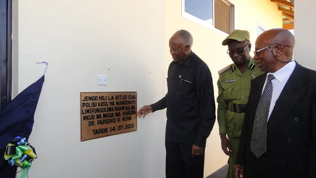 Mkuu wa Mkoa wa Singida Dokta Parseko V. Kone akifungua geti la kuingia katika kituo cha polisi cha Mang'onyi Wilayani Ikungi.